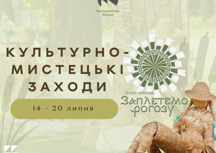 Афіша культурно-мистецьких заходів, які відбудуться з 14 по 20 липня: 15 липня 16:00 - Мистецький проєкт «Ми – Україна» до Дня Української Державності. Виставка виробів із рогози. Де: ЗК «ВЦКС», с. Щітки 16 липня 12:00 - Літературні читання «Книжкова палітра веселого літа» Де: Бібліотека-філія №22 10:00 – Показ пригодницької комедії «Еліо» Де: Кінотеатр «Родина», вул. М. Оводова, 47 12:00 – Показ анімаційної пригодницької сімейної комедії «Кроси» Де: Кінотеатр «Родина», вул. М. Оводова, 47 16:00 – Показ сімейного комедійного екшену «Стволи до гори» Де: Кінотеатр «Родина», вул. М. Оводова, 47 18:00 – Показ пригодницького супергеройського екшену «Супермен» Де: Кінотеатр «Родина», вул. М. Оводова, 47 17 липня 14:00 - Літературна година «Літо без нудьги: сонце, книга, гарний настрій» Де: бібліотека-філія №20 15:...